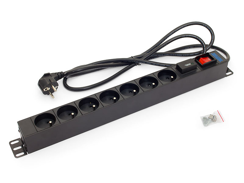 19“ rozvodný panel 1U; 7 x zásuvka podle ČSN, max. 16 A; kabel 3 x 1,5 mm, 2 m + zástrčka univerzál CZ-DE max. 16 A; bleskojistka; podsvícený vypínač; RAL 9005