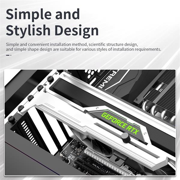 Štýlový variant držiaka grafickej karty je vyrobený z oceľového práškovo lakovaného plechu a plastu.