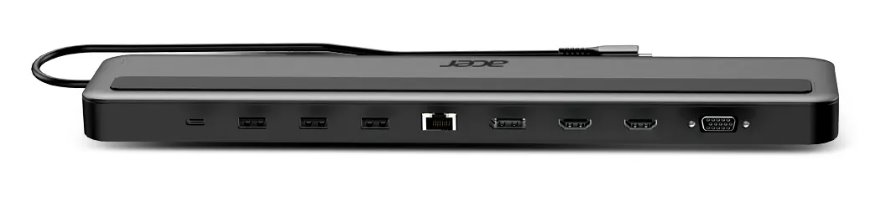 Acer 13in1 Type C Minidock: 3x USB3.0 (5Gbps Data Transfer), 1x USB-C (5Gbps Data transfer), 1x USB-C Power Delivery (up to 100W), 1x SD/TF card slot, 2x HDMI (až 3840x2160P@60Hz), 1x Display Port (až 3840x2160P@60Hz), 1x VGA port (až FHD@60Hz), 1x RJ-45 (Gigabit Ethernet); 3.5mm Audio (up to 96kHz audio output)