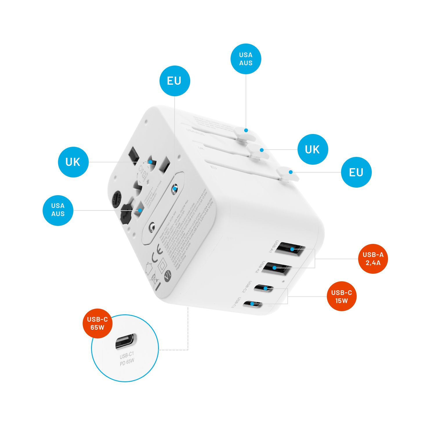 Pořídili jste si mobil, tablet či jiné zařízení v cizí zemi a zástrčka nepasuje do vaší zásuvky? Využijte univerzální vstup na adaptéru. Najdete na něm tři USB-C a dva USB-A konektory s celkovým výkonem 65 W. Díky nim můžete nabíjet více zařízení najednou.