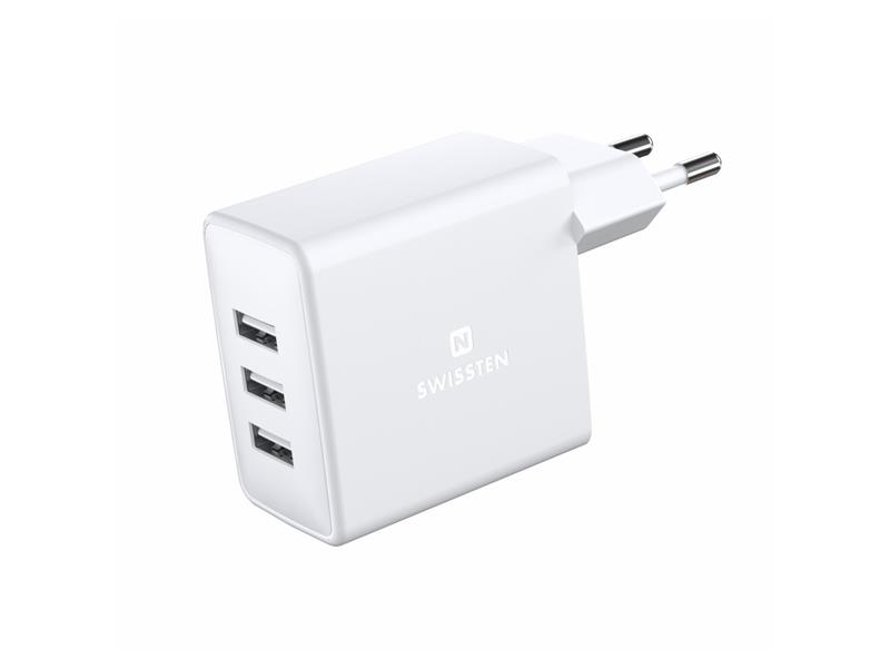 Velice praktický adaptér SWISSTEN se třemi výstupy USB a celkovým výstupem 15W a technologií STMART IC.