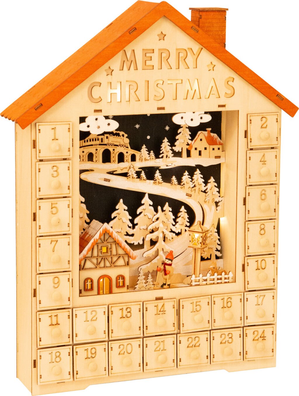 Uprostřed jemně vyřezávaného kalendáře naleznete nádhernou zimní scénu s podlouhou cestou s několika stromy a s domky s bílou pokrývkou sněhu. Scéna je navíc decentně podsvícená, kdy LED diody mají příjemně teplé světlo oranžovo-žluté barvy, které nebude dráždit vaše oči a dokonale zútulní každý kousek vaší domácnosti. Osvětlení můžete kdykoliv vypnout a zapnout pomocí malého vypínače a o napájení se starají 2 AA baterie, což zjednoduší umístění a ještě více rozšíří možnosti vaší vánoční výzdoby. Tuto dekoraci pak můžete používat znovu a znovu každý rok, což vám ušetří peníze za papírové adventní kalendáře na 1 použití.