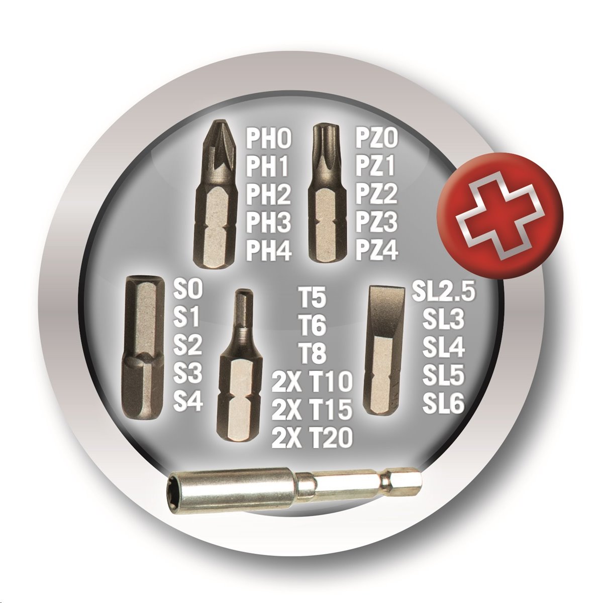 - Stroj se dodává s 30dílnou sadou bitů, takže máte na svojí práci vždy správnou výbavu, díky které dosáhnete profesionálních výsledků