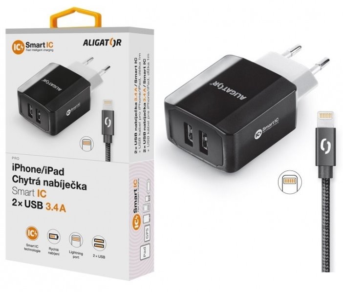 Chytrá síťová nabíječka ALIGATOR 3.4A, 2xUSB, smart IC, černá, kabel pro iPhone/iPad 2A