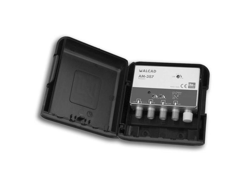 Alcad AM387 je třívstupový stožárový zesilovač v novém vylepšeném designu, zvýšenou odolností proti povětrnostním vlivům a zvýšenou odolností proti rozkmitání. AM387 má potlačené pásmo LTE700 ( má zabudovaný filtr 5G a zesiluje UHF pouze do 694MHz ). Zesilovač je vhodný pro montáž do vnitřního i venkovního prostředí. Jednotlivé vstupy mají samostatnou regulaci zesílení odporovým trimrem, napájení zesilovače +12V je realizováno dálkově po koaxiálním kabelu přes výstup zesilovače, originální napájecí zdroje jsou AL-105 nebo AL-205, které jsou včetně napájecí výhybky a mají v sobě integrován i širokopásmový rozbočovač. Zesilovač je vyráběn SMT technologií a je umístěn v Zamac odlitku, plastový kryt zaručuje zvýšenou ochranu proti povětrnostním podmínkám, plastový kryt zesilovače je přizpůsoben jak k montáži na stožár (pomocí dodávaného třmenu) tak i na stěnu, vstupy a výstupy jsou na F-konektory, u UHF vstupu lze zapnout spínačem napájení pro předzesilovače +12V/50 mA.