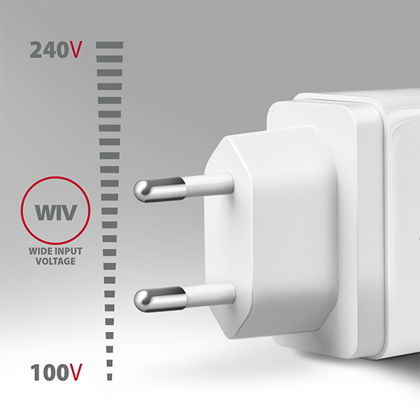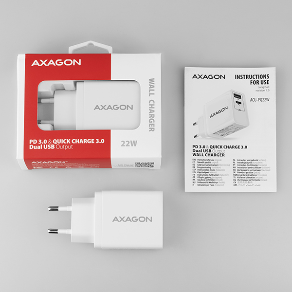 Univerzální USB nabíječka do sítěAXAGON ACU-PQ22Wpro rychlé nabíjení až dvou mobilních zařízení současně.
