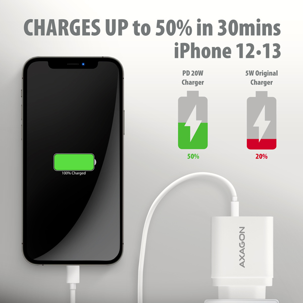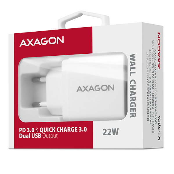 AXAGON ACU-PQ22W, PD & QC nabíječka do sítě 22W, 2x port (USB-A + USB-C), PD3.0/QC3.0/AFC/ FCP/ Apple, bílá