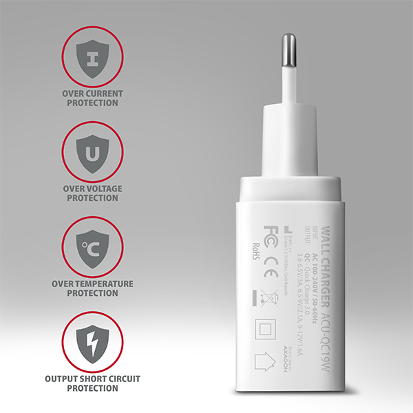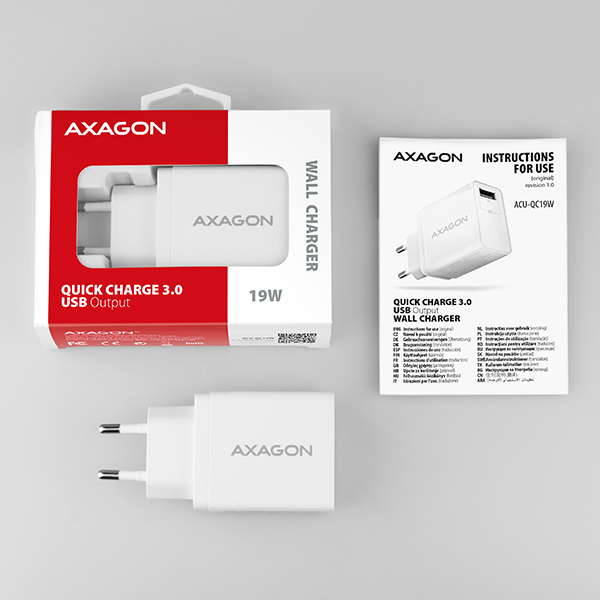 USB nabíječka do sítěAXAGON ACU-QC19Ws technologiíQuick Charge 3.0pro rychlé nabíjení mobilních zařízení.
