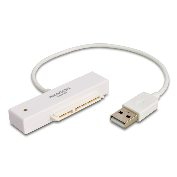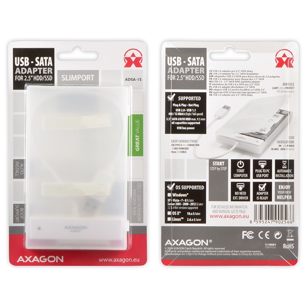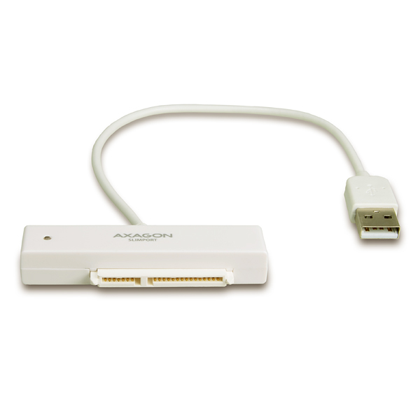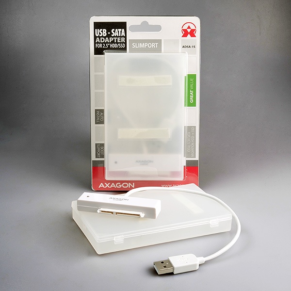 Kompaktní adaptérAXAGON ADSA-1S SLIMports USB 2.0 rozhraním určený pro snadné připojení 2.5" SATA disku.