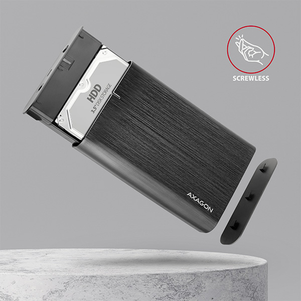 Bezšroubkové otevírání boxuusnadňuje montáž i demontáž 3.5" HDD disku. Vnitřní rámeček je
