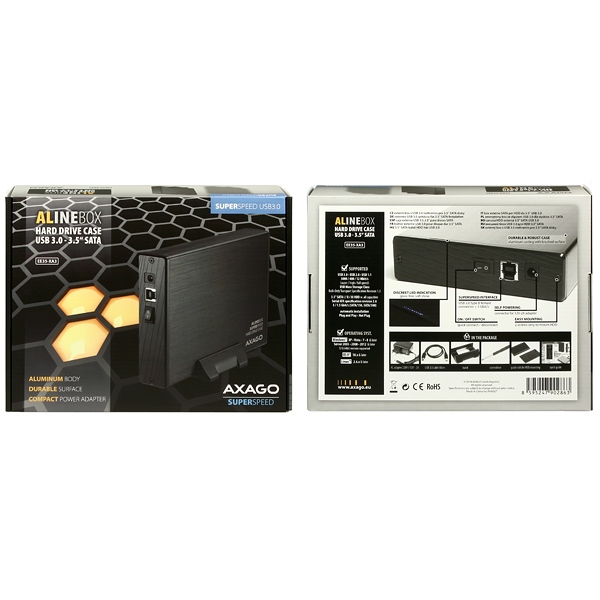 Kompaktní hliníkový externí boxAXAGO EE35-XA3 ALINEboxs vysokorychlostním USB 3.0 rozhraním určený pro 3.5" SATA disky.