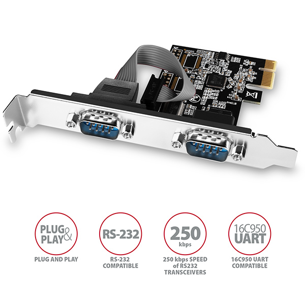 PCI-Express karta AXAGON PCEA-S2N rozšíří stolní počítač o dva sériové RS-232 porty s DB-9 konektory.