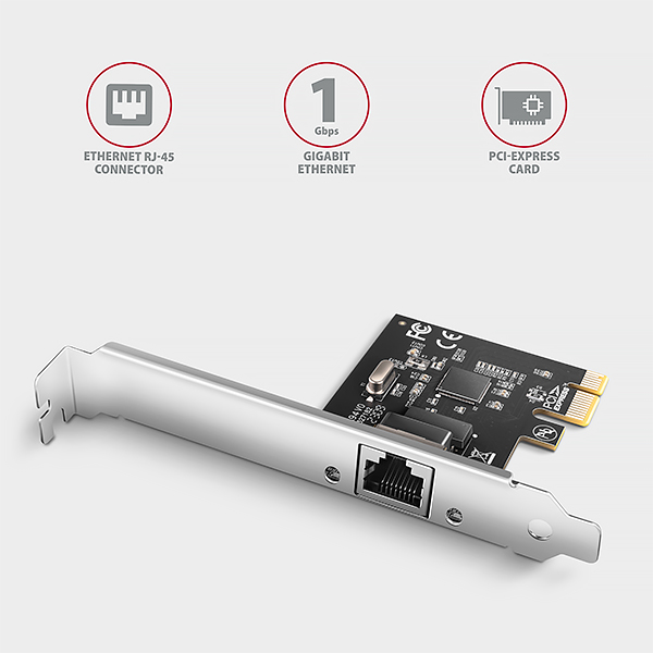 PCI-Express síťová karta AXAGON PCEE-GRL rozšíří stolní počítač o vysokorychlostní Gigabit Ethernet připojení. Umožňuje přenosové rychlosti 10/100/1000 Mbit/s.
