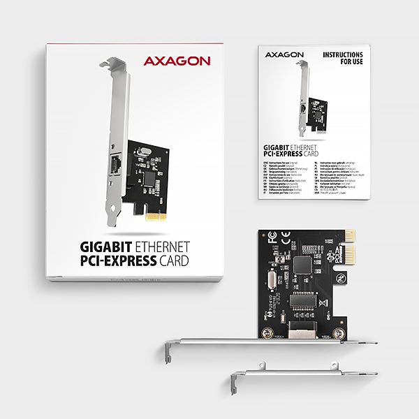PCI-Express síťová kartaAXAGON PCEE-GRLrozšíří stolní počítač o vysokorychlostníGigabit Ethernetpřipojení. Umožňuje přenosové rychlosti 10/100/1000 Mbit/s.