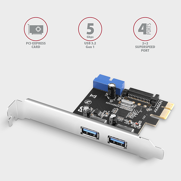 PCI-Express karta AXAGON PCEU-232VLS rozšíří stolní počítač o čtyři USB 3.2 Gen 1 porty . Karta je navržena pro rychlé datové přenosy rychlostí až 5 Gb/s .