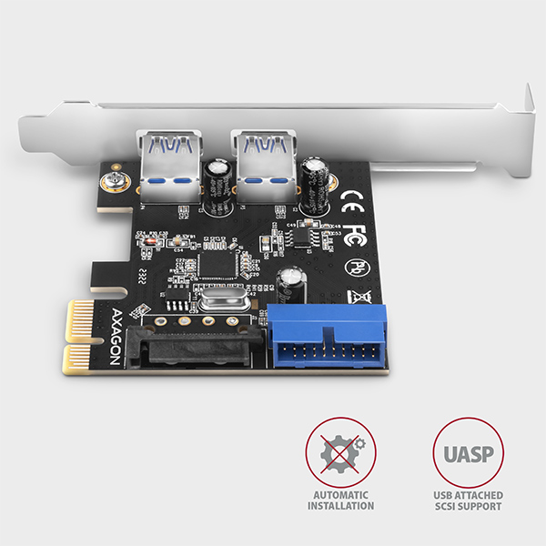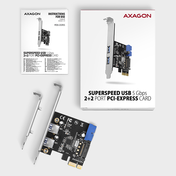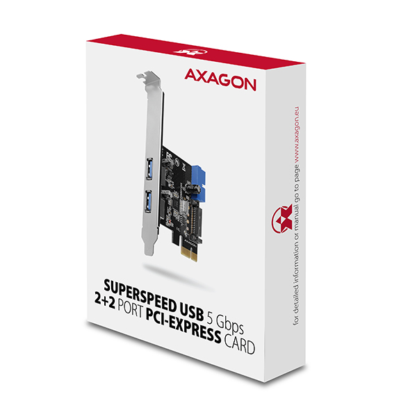 PCI-Express kartaAXAGON PCEU-232VLSrozšíří stolní počítač očtyři USB 3.2 Gen 1 porty. Karta je navržena pro rychlé datové přenosyrychlostí až 5 Gb/s.