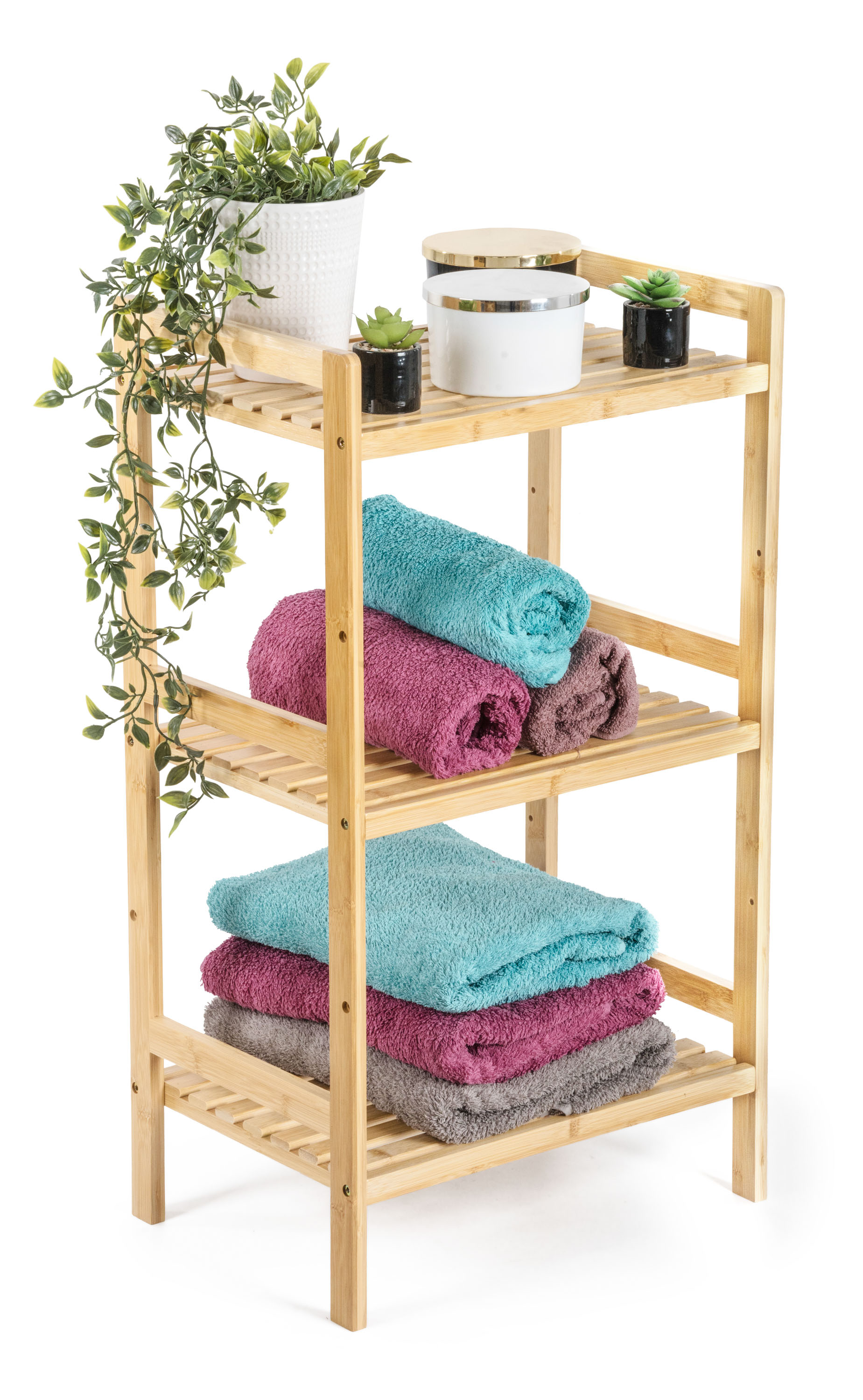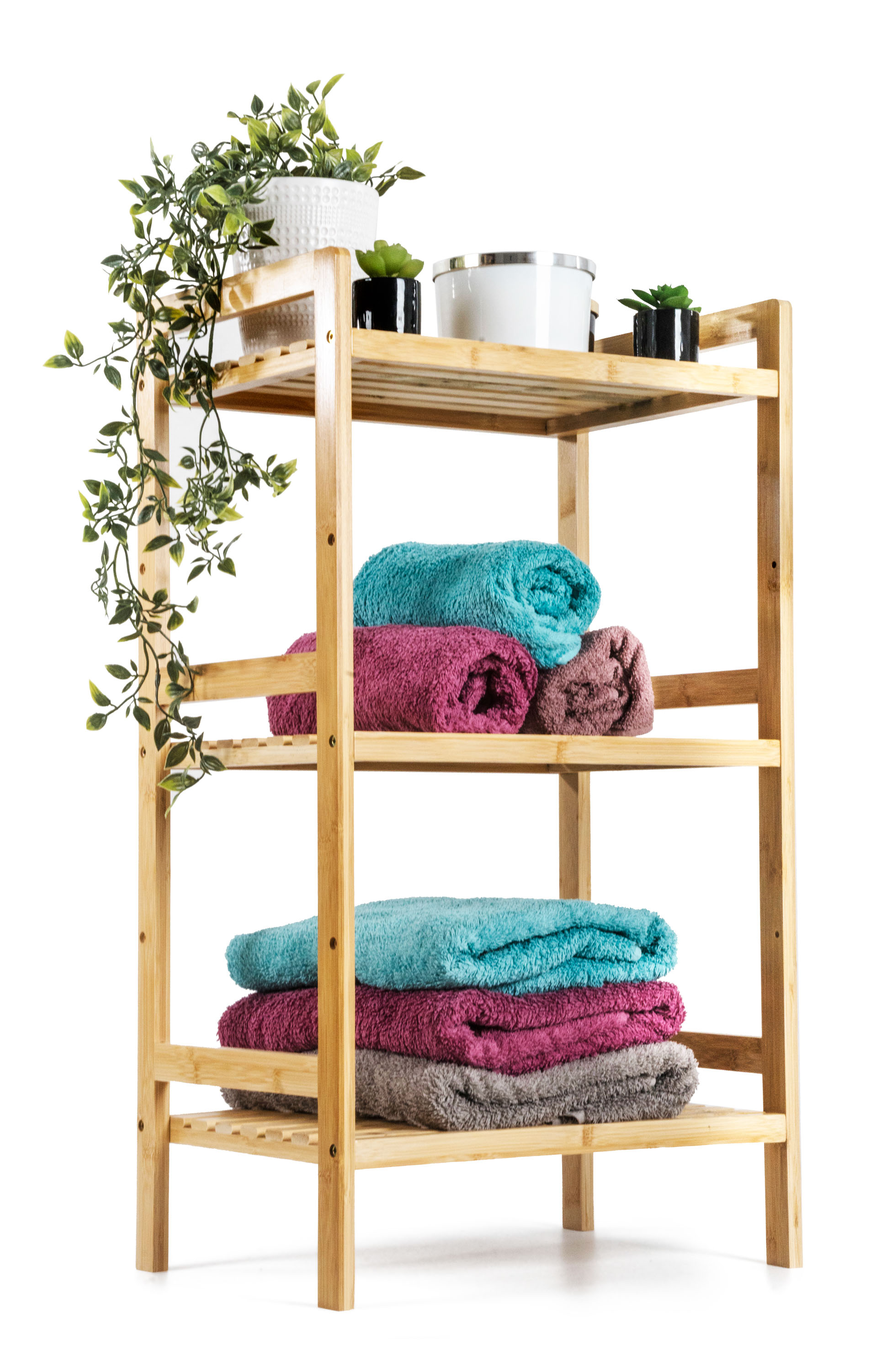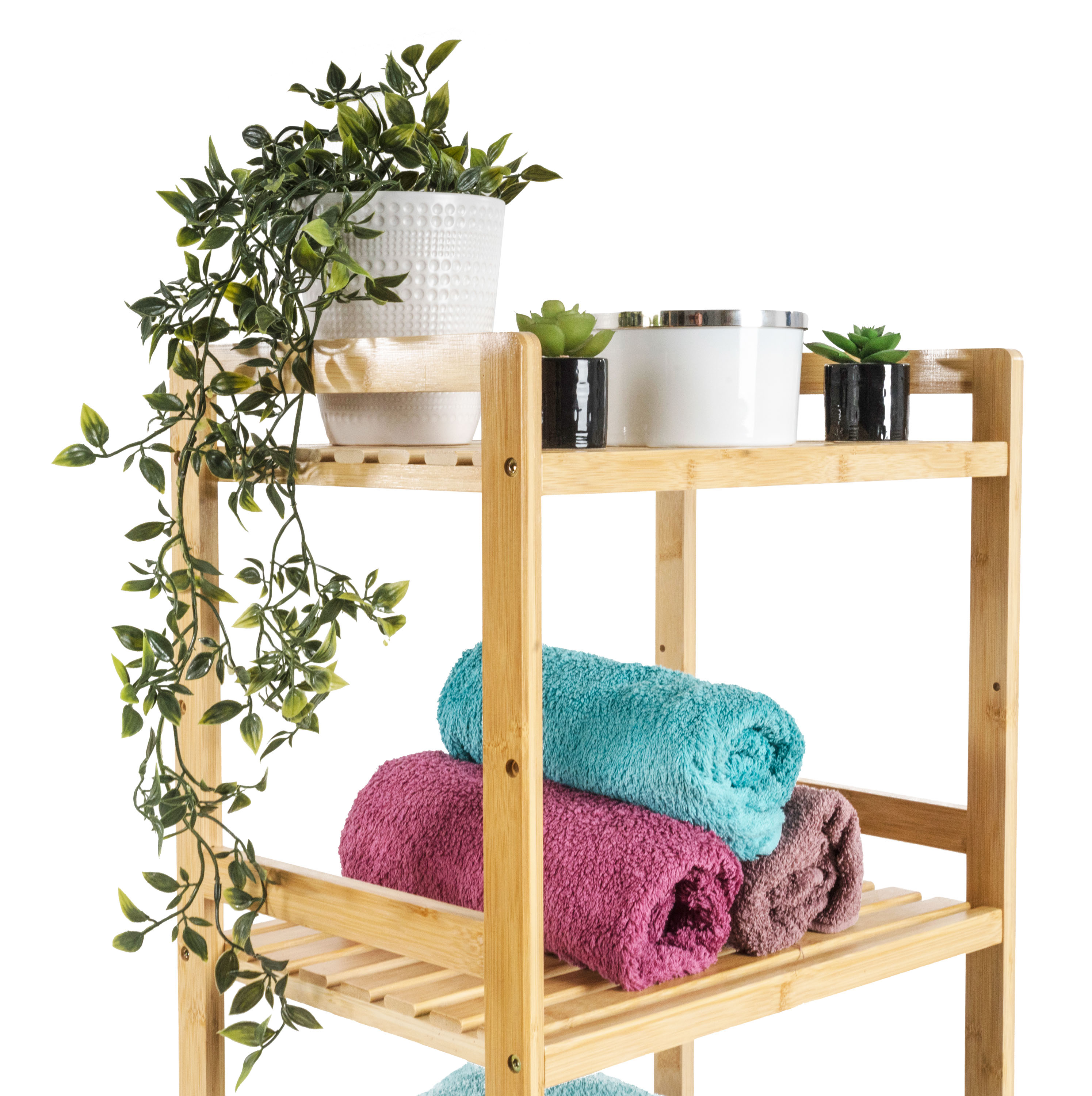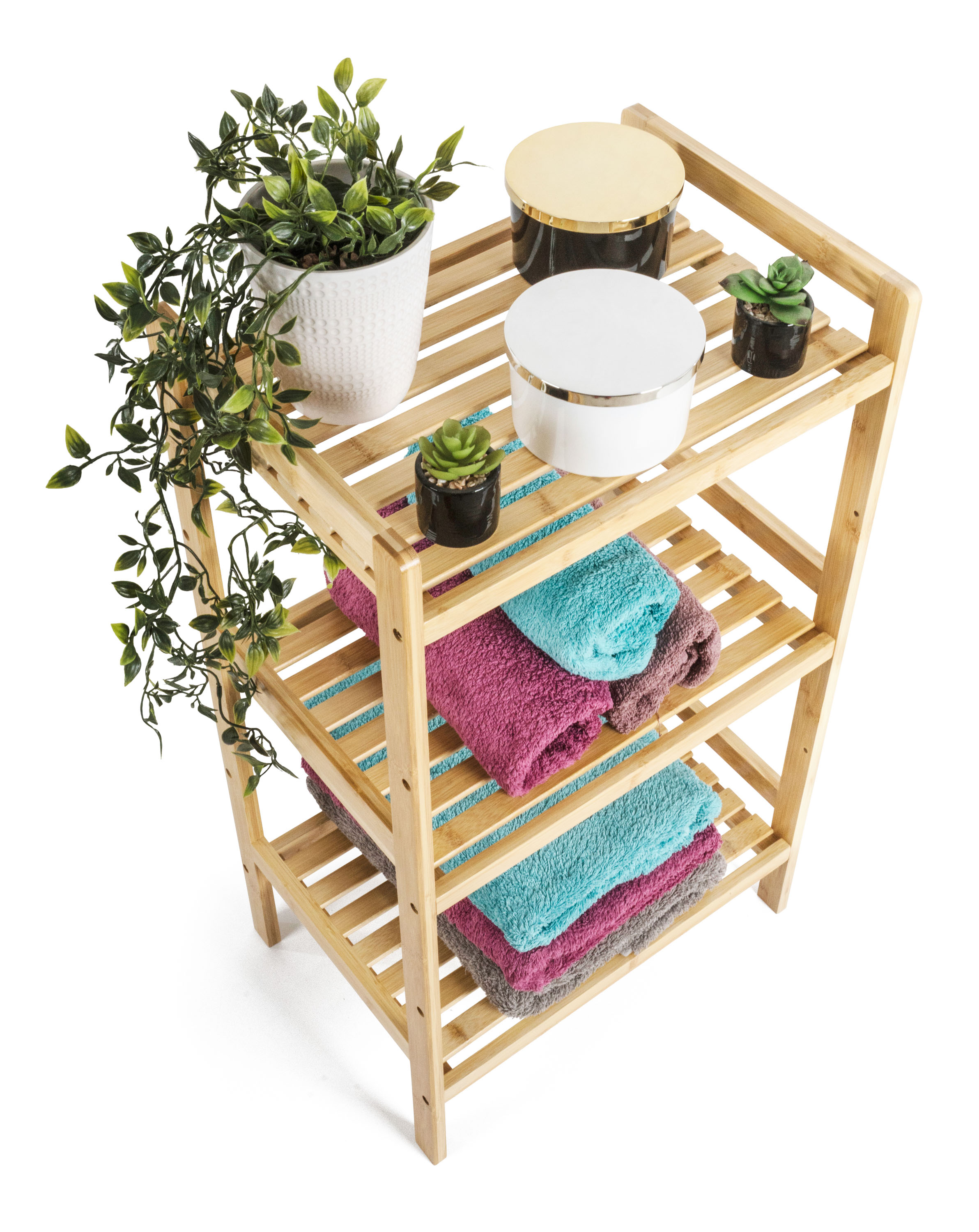 Bambus je překvapivě lehký, takže s celým stojanem s policemi můžete snadno manipulovat. Zároveň je ale dostatečně pevný, takže unese i větší zátěž. Jednou z výborných vlastností bambusového dřeva je navíc jeho velká odolnost vůči vlhkosti a přirozená odolnost vůči bakteriím a plísním, takže se nemusíte obávat jeho umístění v koupelně nebo prádelně.