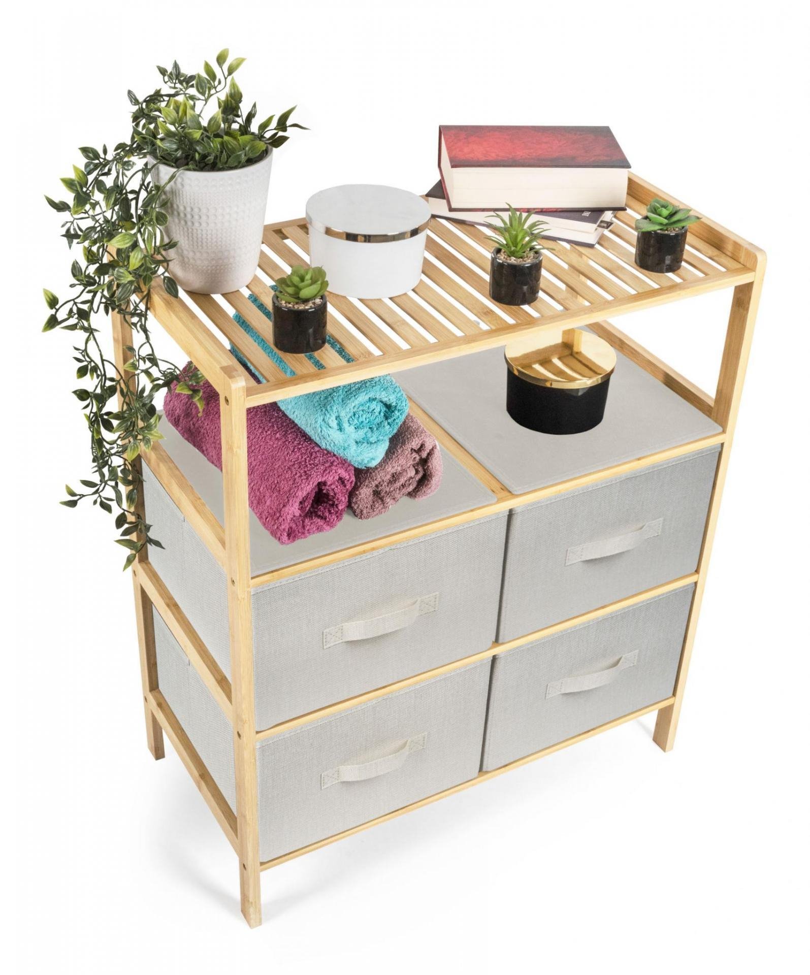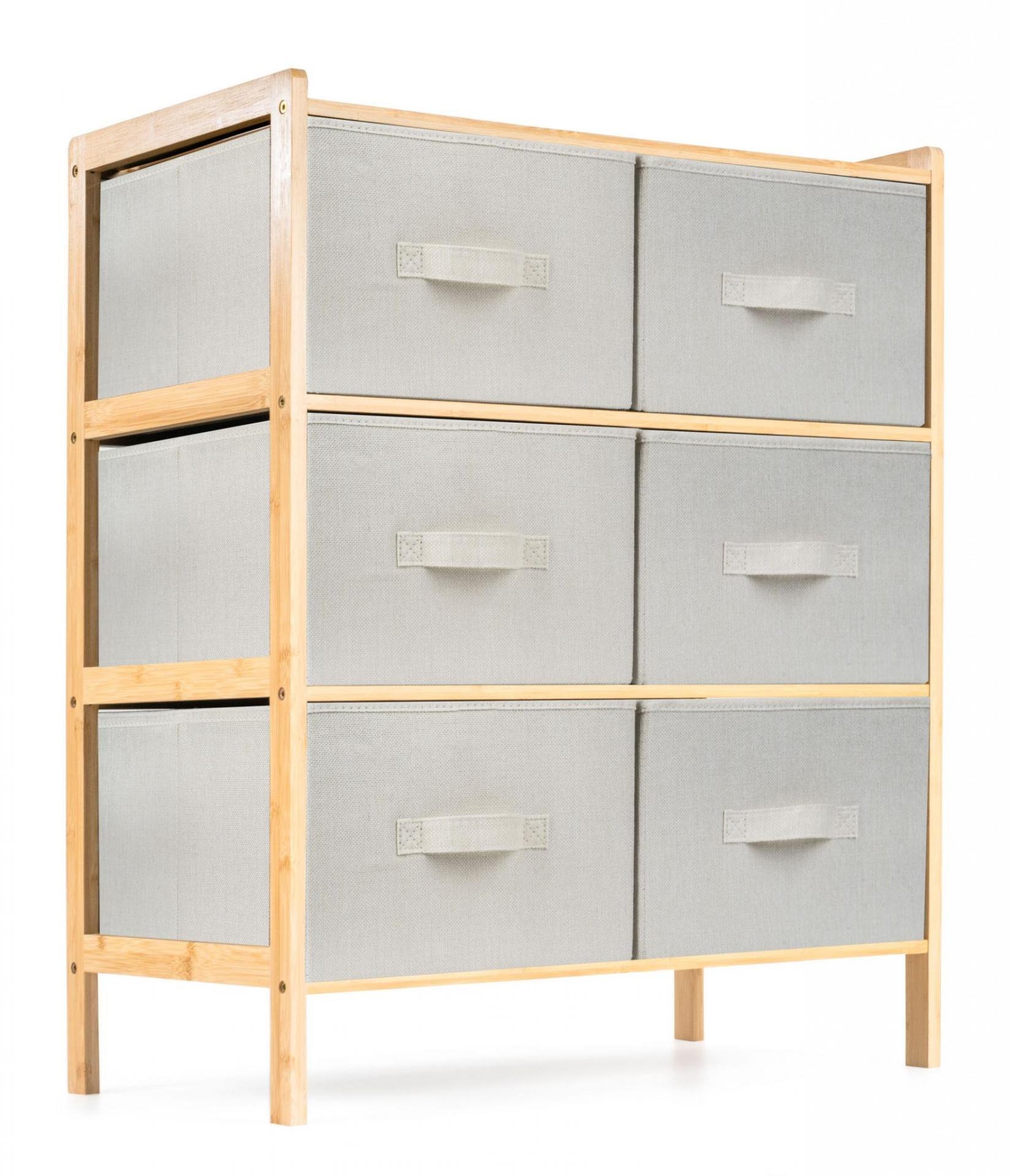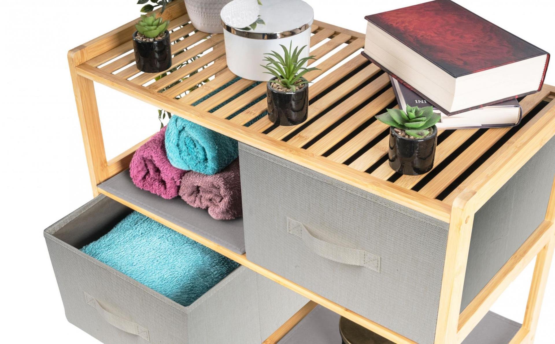 Bambusový regál s výsuvnými látkovými zásuvkami dodává interiéru příjemný přírodní dojem, pocit lehkosti a přirozenosti, zatímco jeho pevnost a dlouhá životnost zajišťují stabilitu a trvanlivost.