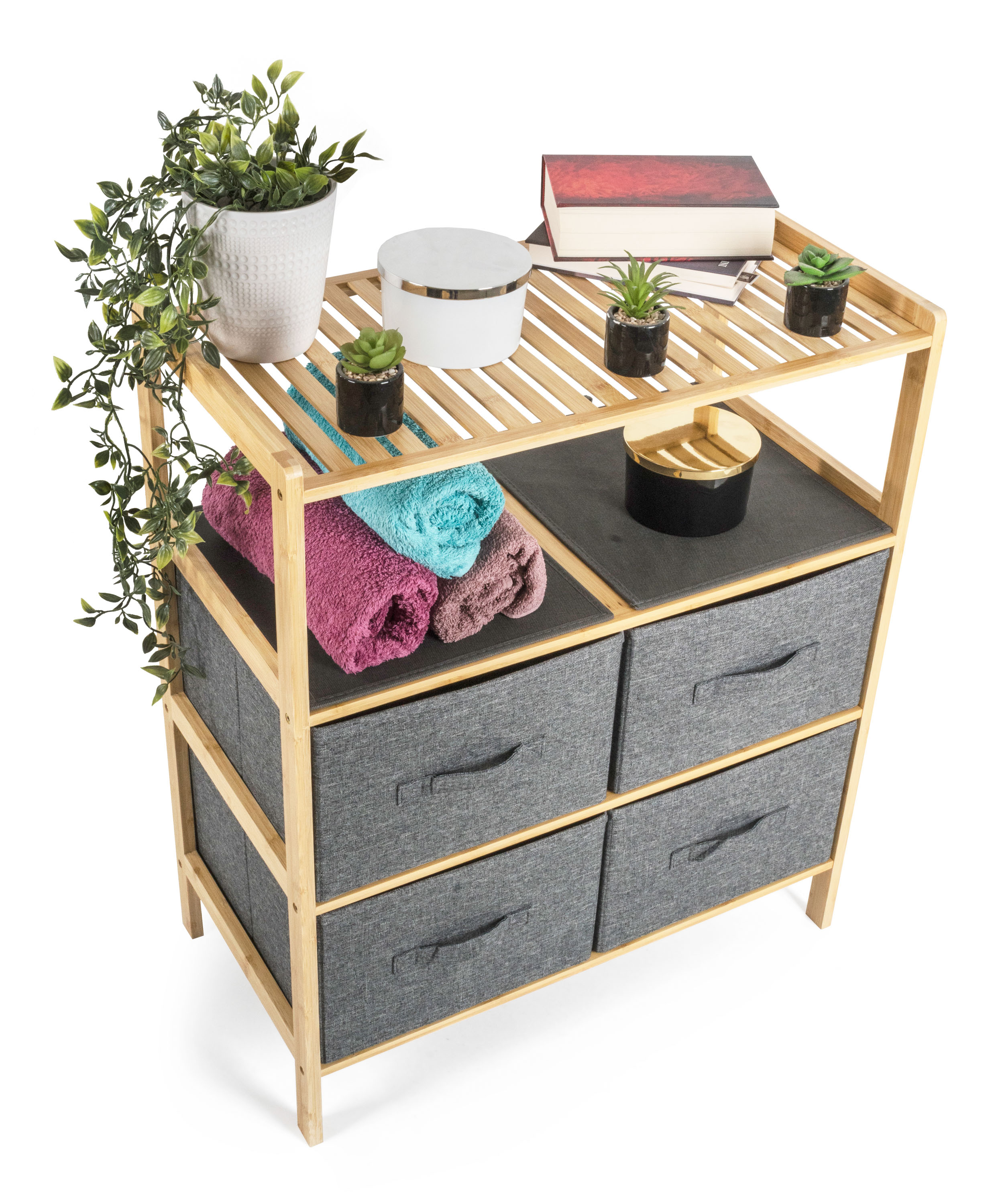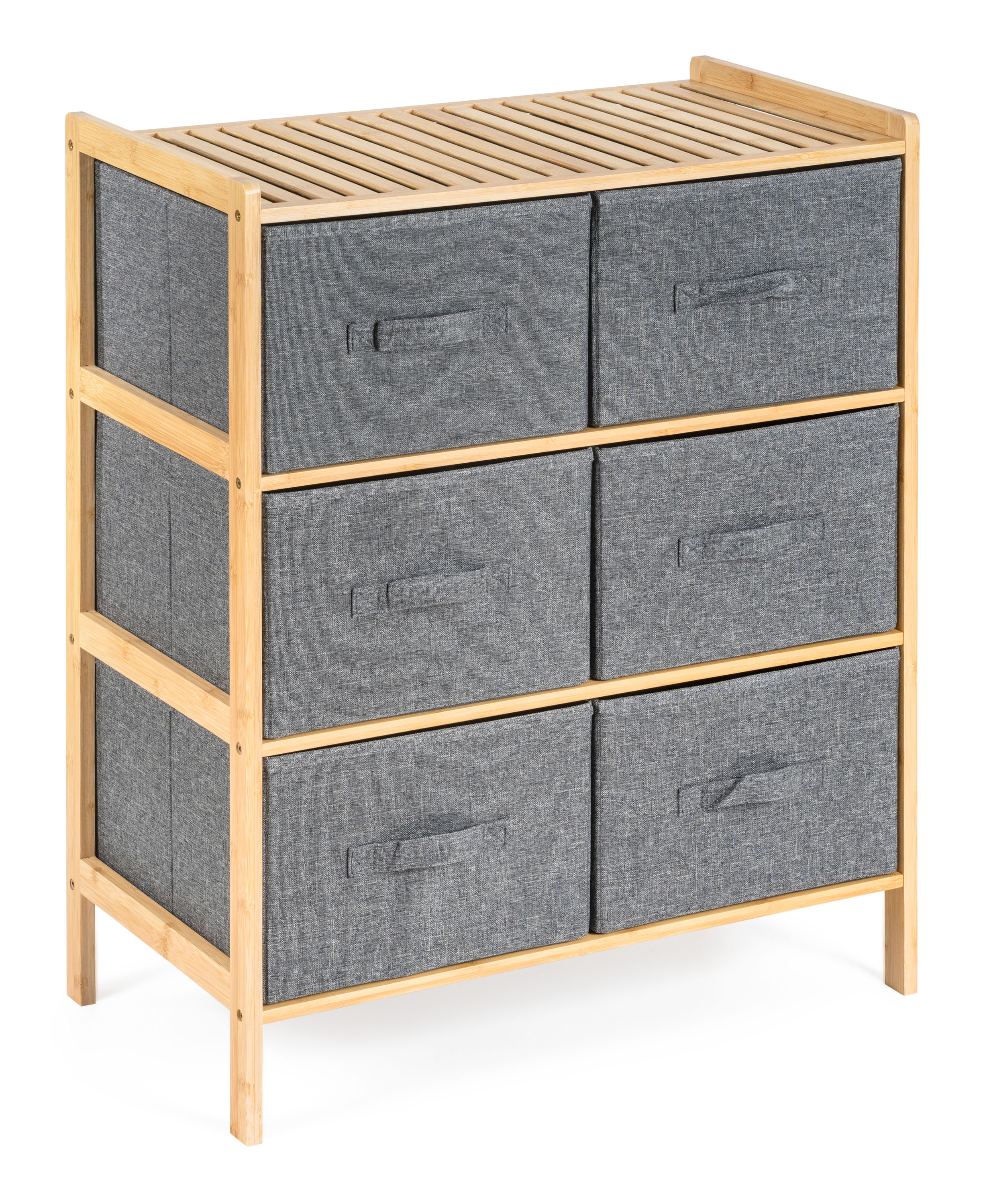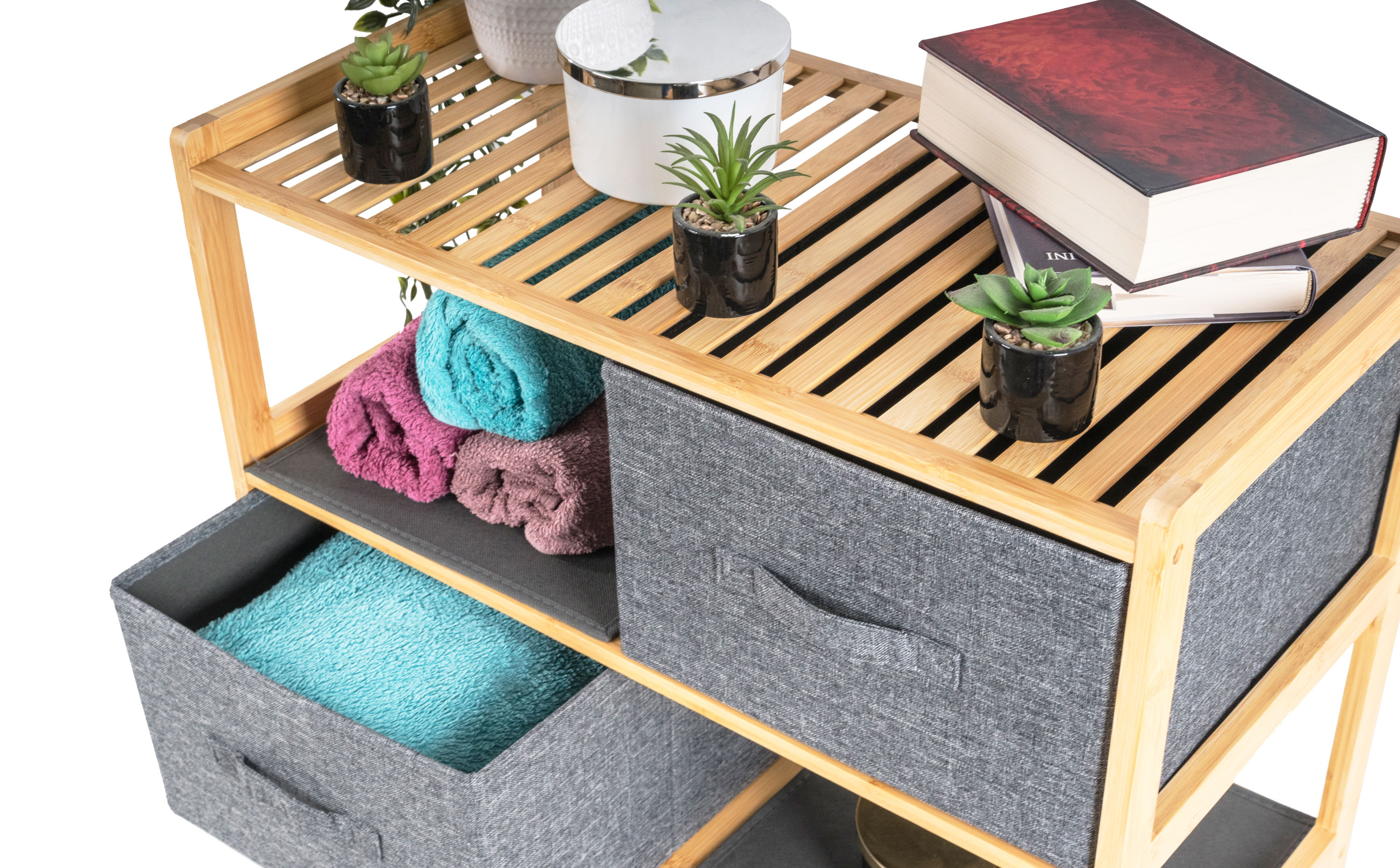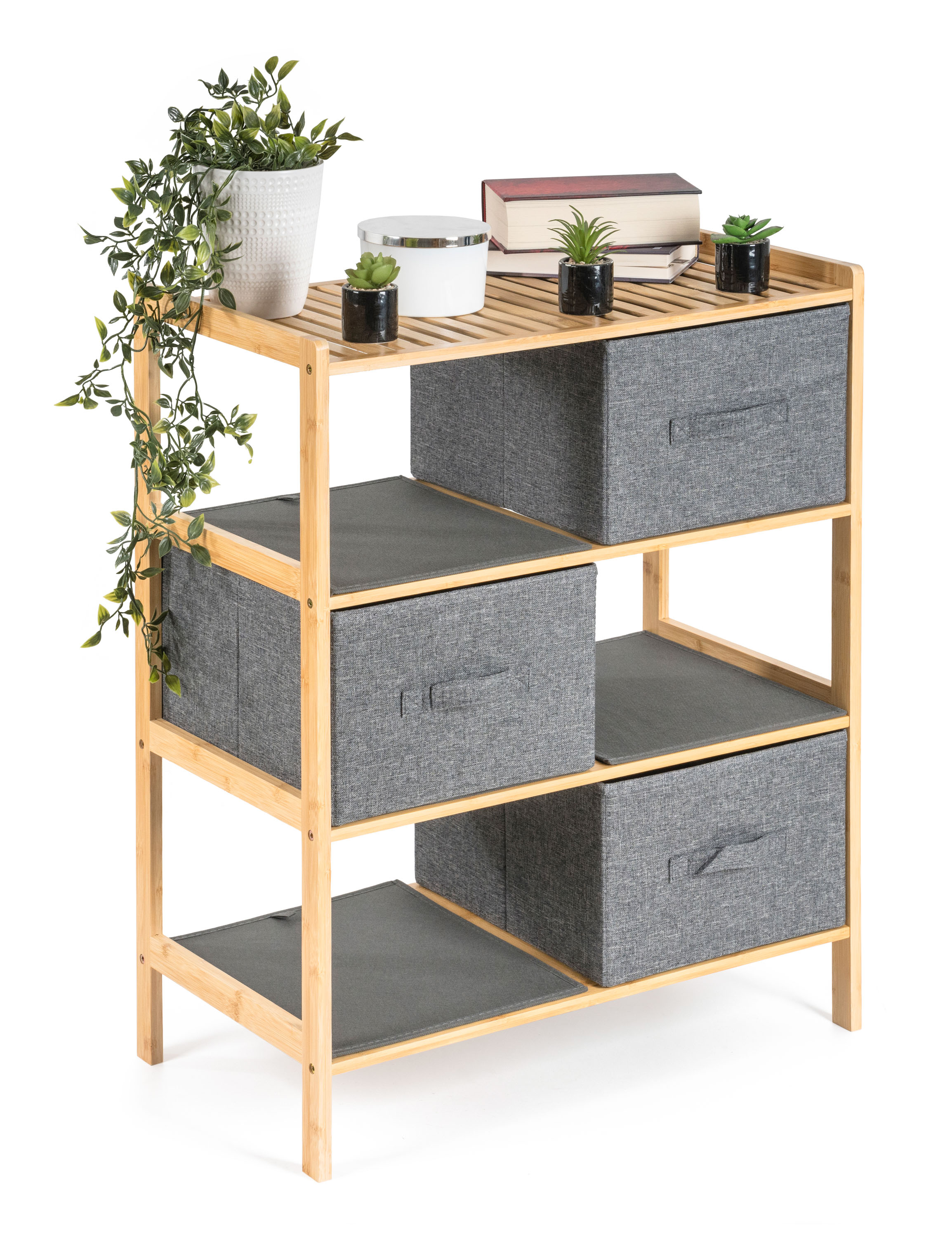Bambusový regál s výsuvnými látkovými zásuvkami dodává interiéru příjemný přírodní dojem, pocit lehkosti a přirozenosti, zatímco jeho pevnost a dlouhá životnost zajišťují stabilitu a trvanlivost.