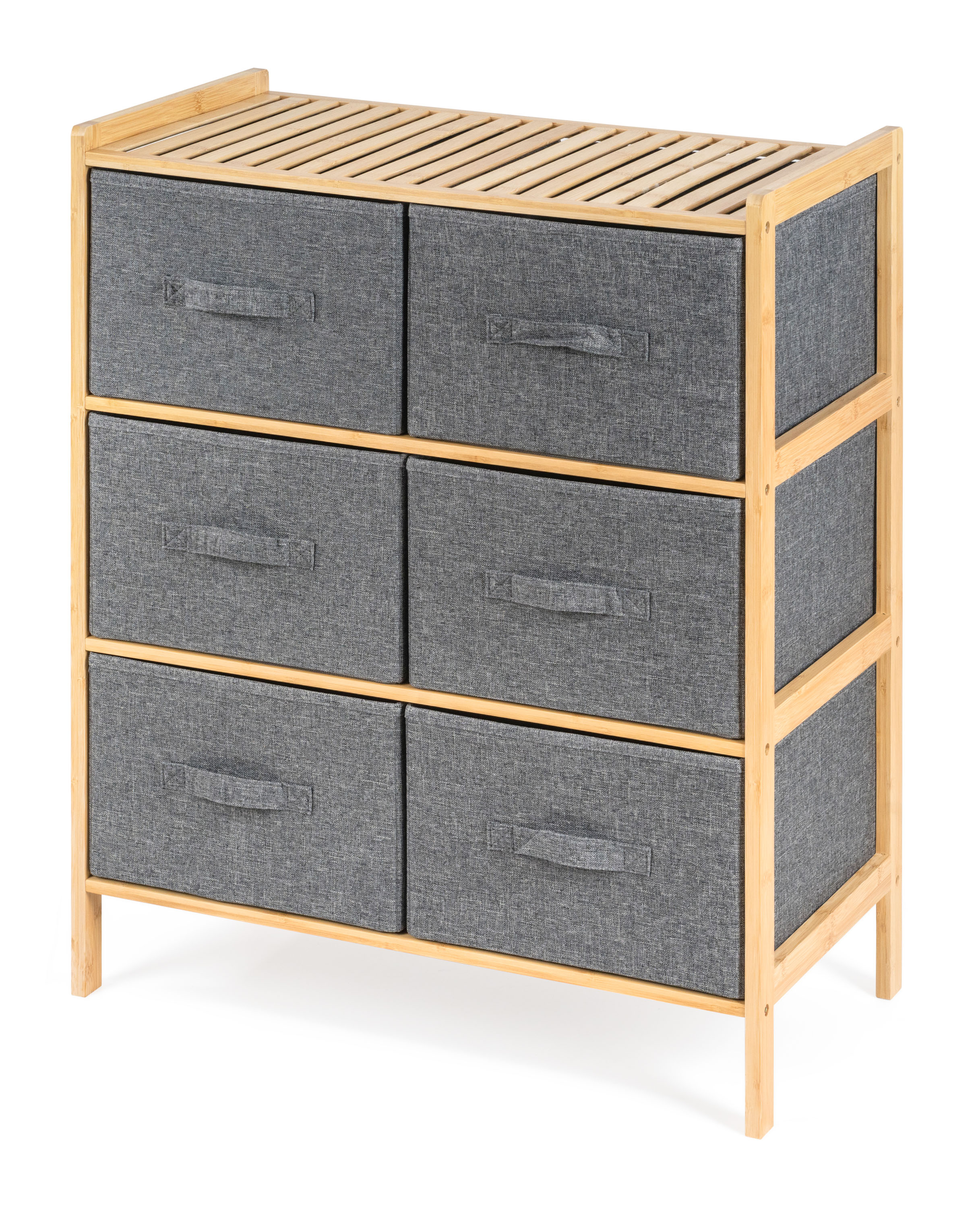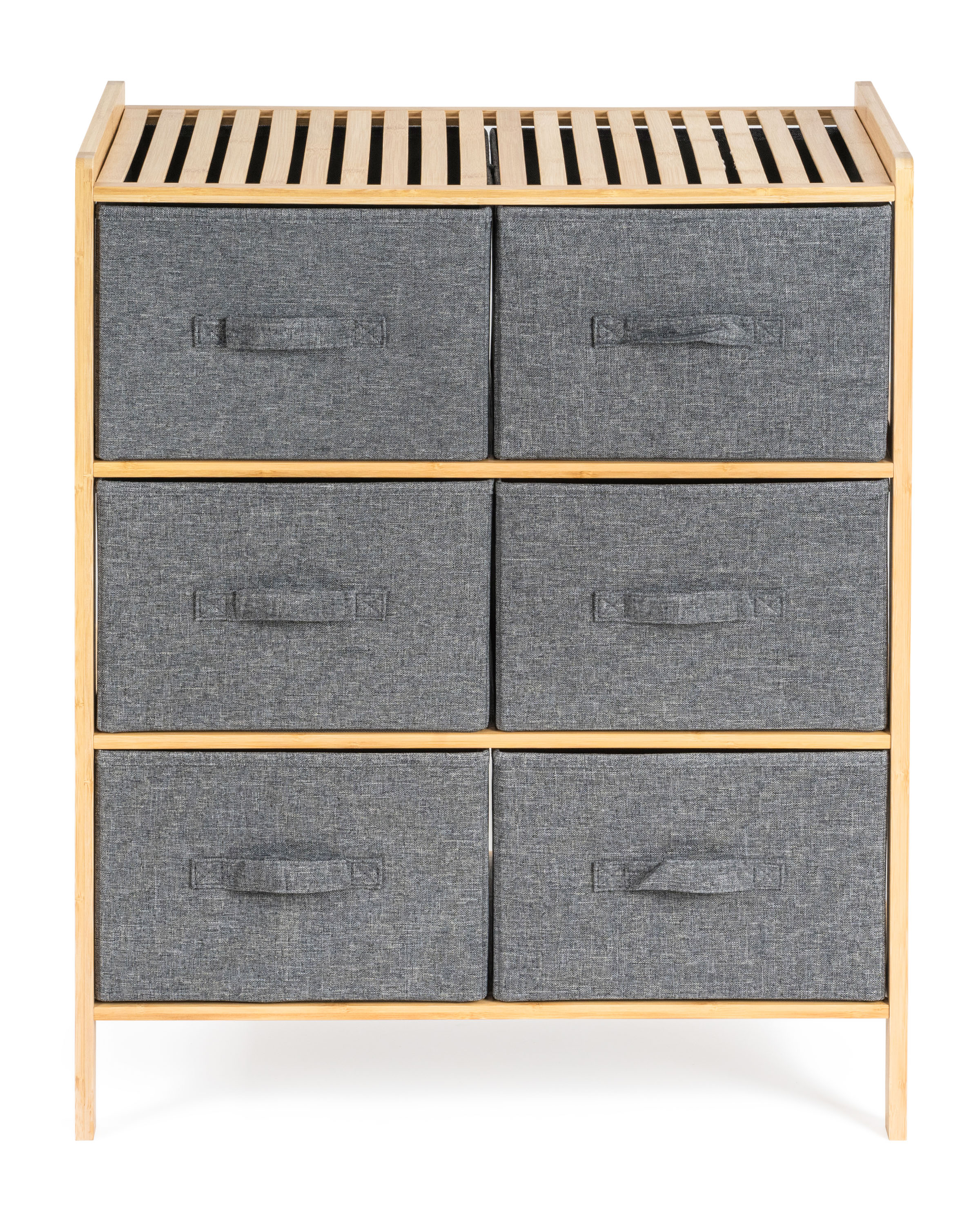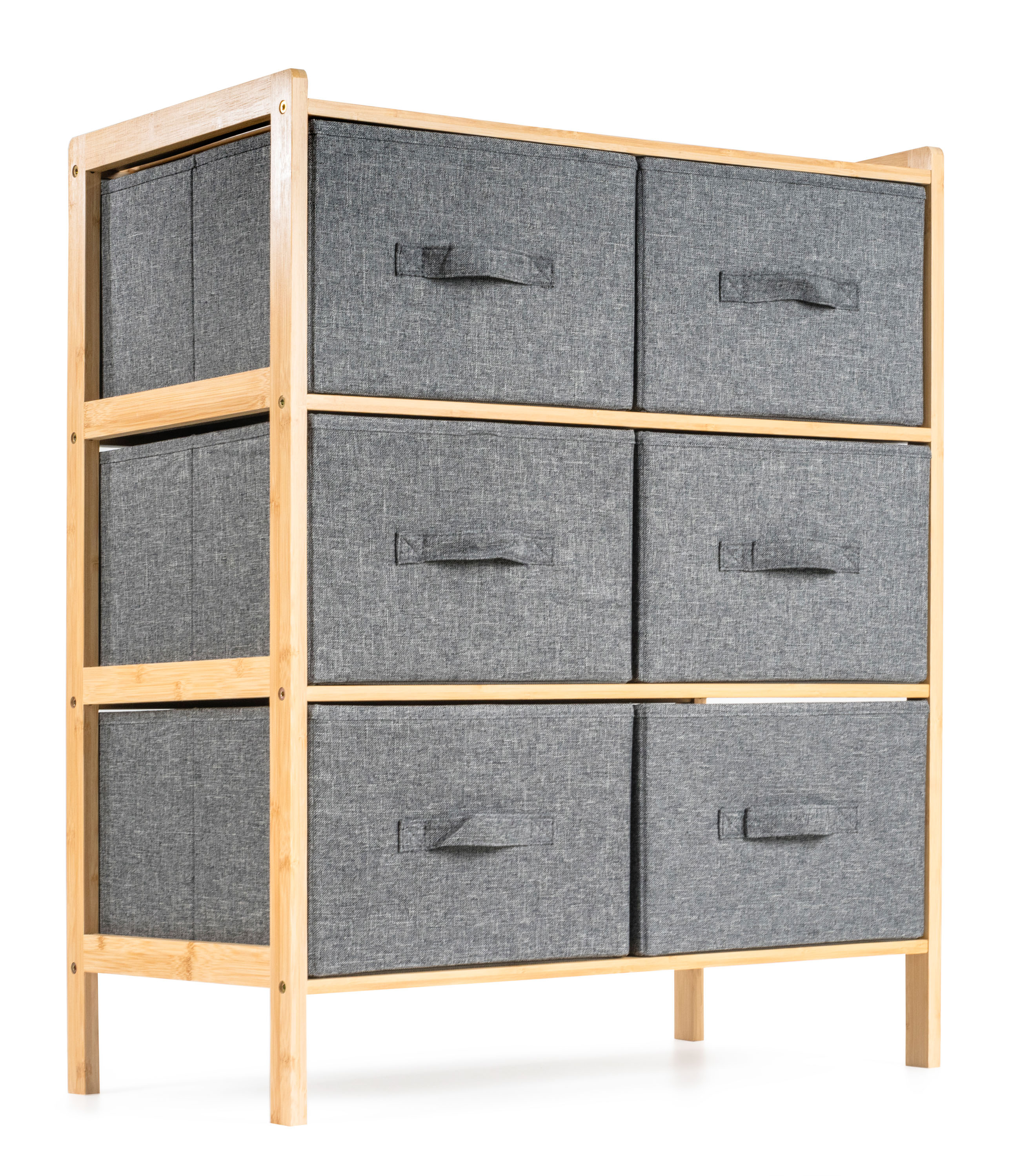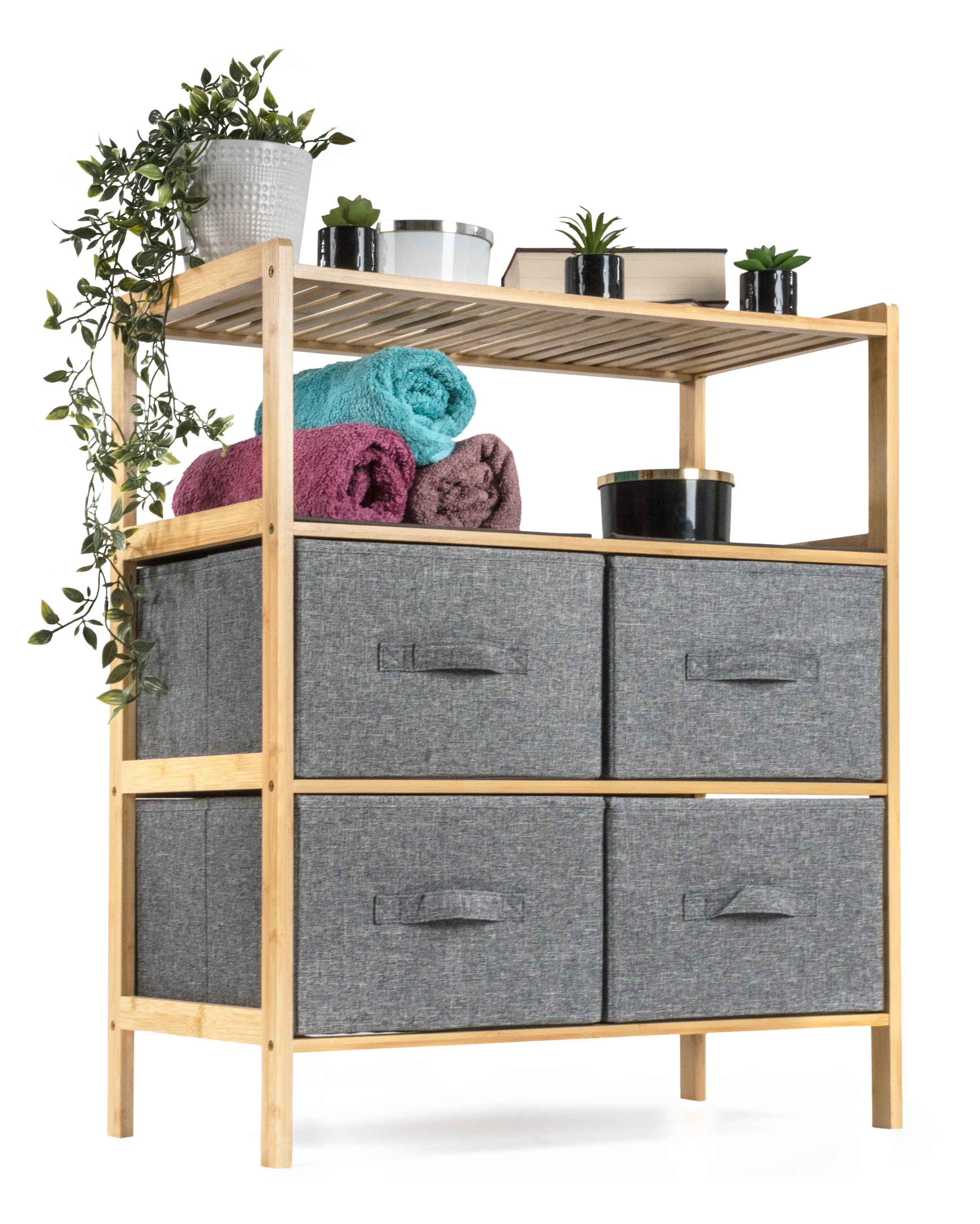 Bambusový regál s výsuvnými látkovými zásuvkami dodává interiéru příjemný přírodní dojem, pocit lehkosti a přirozenosti, zatímco jeho pevnost a dlouhá životnost zajišťují stabilitu a trvanlivost.