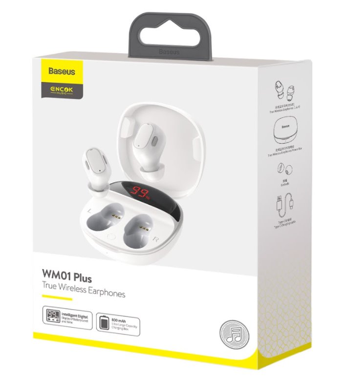 Baseus Encok WM01 Plus špuntová sluchátka v nabíjecím pouzdře, které je vybaveno displejem s přesným stavem nabití baterie.