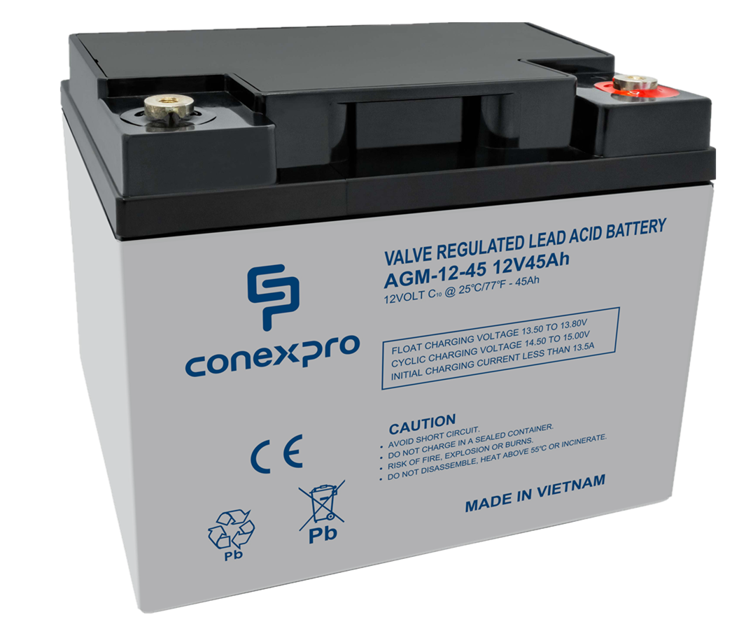 Hermeticky uzavřený olověný akumulátor Conexpro AGM-12-45 o kapacitě 45 Ah a napětí 12 V je vhodný pro zdroje nepřerušovaného napájení, požární, zabezpečovací, přístupové, telekomunikační a solární systémy i pro celou řadu dalších aplikací. Řadí se mezi bezúdržbové VRLA AGM baterie s elektrolytem, který je nasáklý v netkané tkanině ze skelných vláken. Tento model je tak odolný vůči otřesům a vytečení a práce v náklonu či jiné poloze mu nebude dělat žádné obtíže. Akumulátor má navíc výborné nabíjecí charakteristiky, nabízí lepší teplotní stabilitu, odolá cyklické zátěži (nabíjení a vybíjení) a dosahuje životnosti až 10 let, díky čemuž vám bude sloužit naprosto spolehlivě.