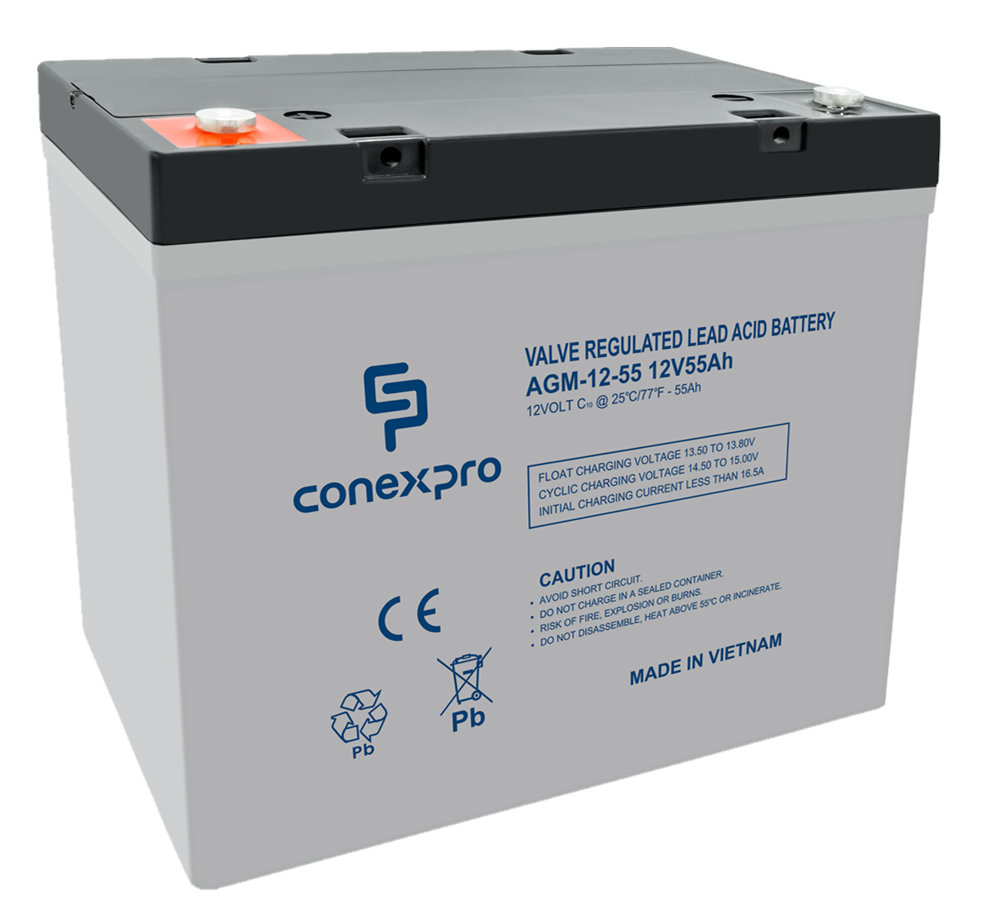 Hermeticky uzavřený olověný akumulátor Conexpro AGM-12-55 o kapacitě 55 Ah a napětí 12 V je vhodný pro zdroje nepřerušovaného napájení, požární, zabezpečovací, přístupové, telekomunikační a solární systémy i pro celou řadu dalších aplikací. Řadí se mezi bezúdržbové VRLA AGM baterie s elektrolytem, který je nasáklý v netkané tkanině ze skelných vláken. Tento model je tak odolný vůči otřesům a vytečení a práce v náklonu či jiné poloze mu nebude dělat žádné obtíže. Akumulátor má navíc výborné nabíjecí charakteristiky, nabízí lepší teplotní stabilitu, odolá cyklické zátěži (nabíjení a vybíjení) a dosahuje životnosti až 10 let, díky čemuž vám bude sloužit naprosto spolehlivě.