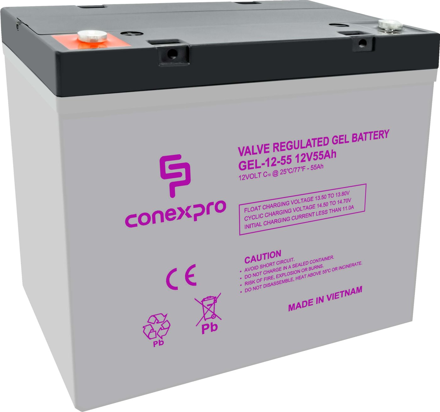 Gelová baterie Conexpro s výstupním napětím 12 V a kapacitou 55 Ah má širokou škálu využití. Použijete ji jako záložní zdroj a UPS, pro elektronické protipožární systémy, elektronické zabezpečovací systémy, nouzová osvětlení, napájení elektromotorů, telekomunikační zařízení nebo zálohování oběhových čerpadel či kotlů. Snoubí v sobě úžasný poměr výkonu a velikosti.