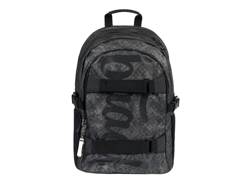 Antracitový batoh Skate Ash se zajímavou texturou a pásy na uchycení skateboardu, který je vhodný pro kluky i holky od 3. třídy ZŠ až na druhý stupeň.