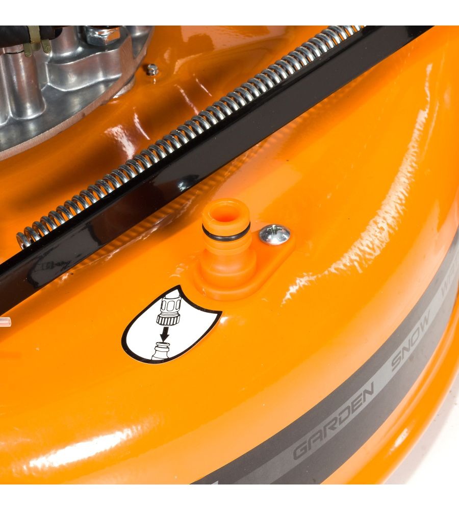 Když skončíte se sekáním, plášť a tělo můžete snadno umýt. Stačí připojit zahradní hadici do rychlospojky na plášti sekačky a sekačku spustit.