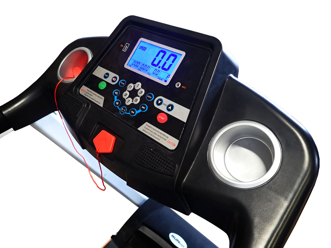 Zabavte se při běhání. Vstup na MP3 se dvěma reproduktory ocení každý milovník hudby. Dvě odkládací kapsy vám navíc poskytnou prostor pro uložení různých pomůcek. V případě nutnosti vám rychlobrzda umožní pás okamžitě vypnout. Stačí vysunout bezpečnostní klíč a pás se zastaví.