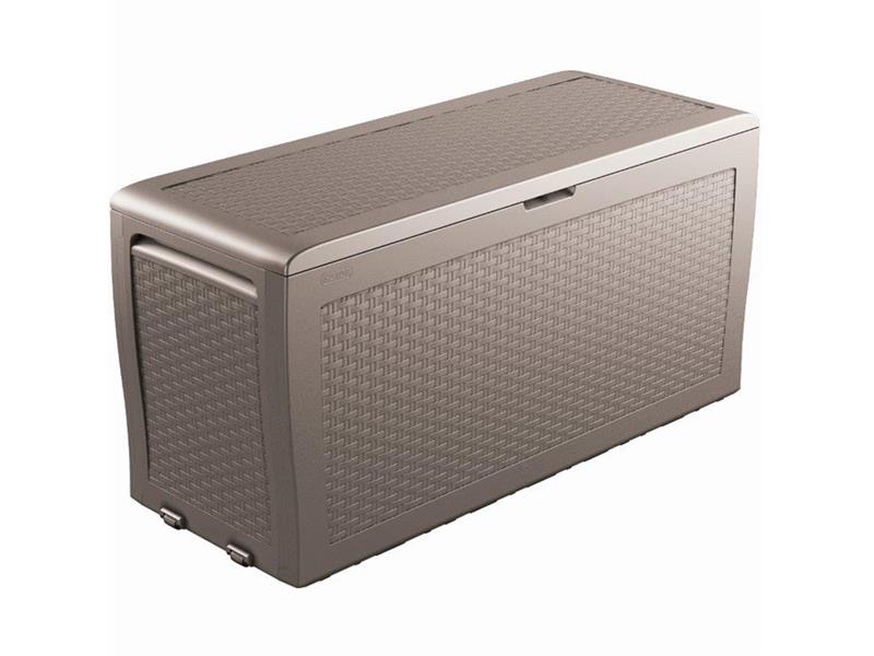Zahradní box je vyrobený z vysoce kvalitní polypropylenové pryskyřice v moderním designu, který imituje strukturu přírodního ratanu. Skříň je nízká a její propracovaná konstrukce zvládne unést až 200 kg, takže ji mohou využít k sezení až 2 dospělé osoby. Stěny jsou vyztužené žebrovými segmenty, takže skříň hravě odolá i drsnému zacházení a vandalismu a nevadí ji ani extrémní počasí či UV záření.