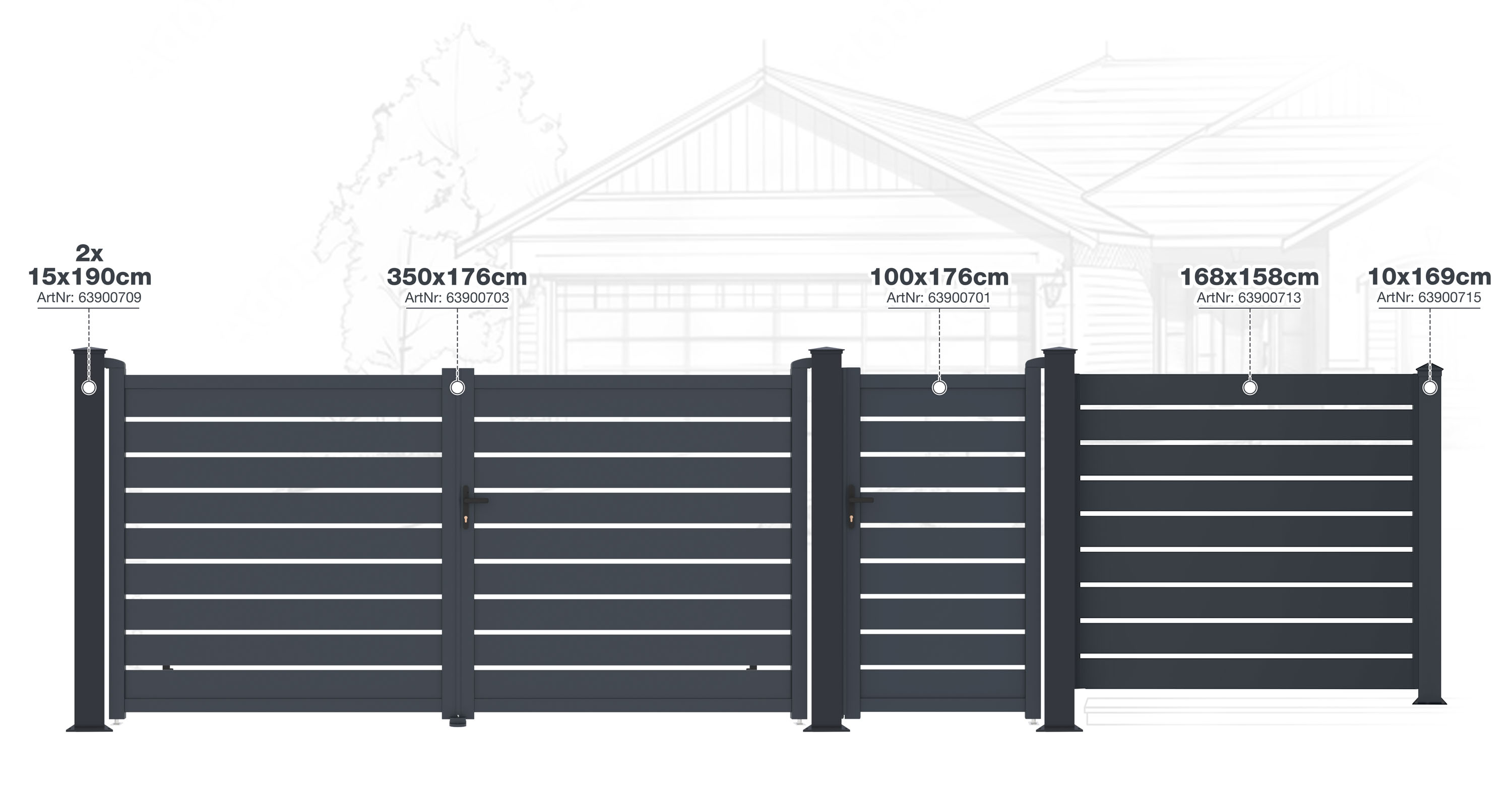 Vjezdová brána je důležitou součástí oplocení. 176 cm vysoká hliníková brána Reno má díky práškovému nástřiku ještě delší životnost, je odolná a zároveň působivá. Otevírání na kliku a zámek s FAB vložkou, šířka 350 cm umožní hladký průjezd všech vozidel.