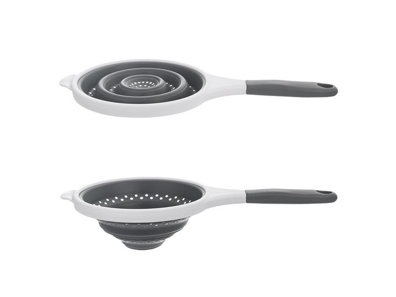 Skládací silikonový cedník využijete pro cezení nejrůznějších potravin v kuchyni. Jeho výhodou je tvarovatelná cedicí část – při ukládání ji zamáčknete a nezabere Vám mnoho místa. Skvělý do karavanů, kempů, na chatu.