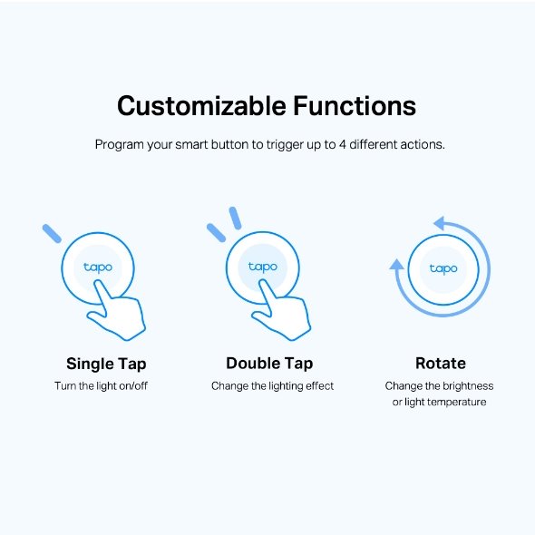 Chytré bezdrátové tlačítko TP-Link Tapo S200B ocení každý, komu nevyhovuje ovládání smart osvětlení, elektroniky a jiných zařízení Tapo pomocí hlasu nebo aplikace. Jediným klepnutím zhasnete nebo vypnete zařízení, dvojitým klepnutím změníte efekt osvětlení a rotací si přizpůsobíte jas a teplotu světla.