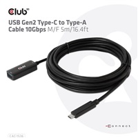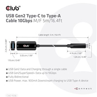 The Club 3D CAC-1536 USB Gen2 Type-C to Type-A Cable 10Gbps M/F 5m/16.4ft cable connects your Notebook, Tablet or Phone with USB Type-C output to your favorite existing Peripherals, Accessories and Chargers featuring the common USB Type-A plug. It enables Data and Power over a single cable and both ways. This cable supports USB 3.2 Gen 2. SuperSpeed+ data up to 10Gbps and up to 900mA output for Downstream charging or powering your USB Type-A enabled Notebook, Tablet or Smartphone.