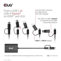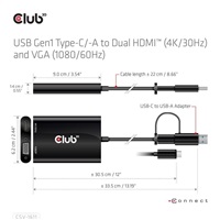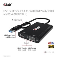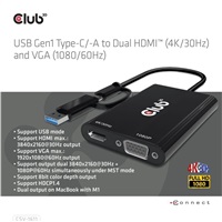 The Club 3D CSV-1611 USB Gen1 Type-C/-A to Dual HDMI™ (4K/30Hz) and VGA (1080/60Hz) adapter is a Dual Display adapter which provides most advanced, efficient solution to extend a single USB Type-C or Type-A port to HDMI™ and VGA displays. It supports single HDMI™ 4K/30Hz and VGA 1080P/60Hz or dual 4K/30Hz + VGA 1080P/60Hz simultaneous output of different videos. It can work on USB Mode and DP Alt mode supported Type-C and USB-A host. Dual Video output on MacBook with M1. Support USB Gen1 with max 5Gbps data transmission. The unit is powered thru the USB Type-A or Type-C host connection. No external power needed.