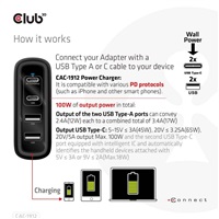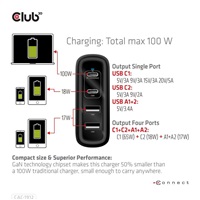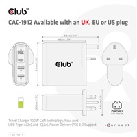 The Club 3D CAC-1912 Travel Charger 100W GaN technology, Four port USB Type-A(2x) and -C(2x), Power Delivery(PD) 3.0 Support is a high-performance and fashionable design travel charger. It is equipped with four USB connectors that are for output interfaces, this product allows four devices to be charged at the same time. And the two USB Type-A ports can convey 2.4A each to total 3.4A. The USB Type-C port is specially designed for notebooks with a USB Type-C Host connection for a total 18W (5V/3A,9V/2A) output. The top USB Type-C port is specially designed for the USB Type-C notebooks with total 65W-100W (5~15V/3A,20V/3.25A,20V/5A) output. The maximum power output for single USB Type-C port is 100W. It is suitable to charge mobile phones, tablets and laptops. The unique design makes your life simpler and easier.