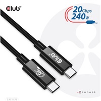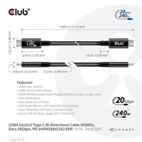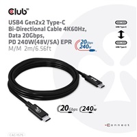 The Club 3D CAC-1575 USB4 Gen2x2 Type-C Bi-Directional Cable, Video up to 4K60Hz, Data 20Gbps, PD 240W(48V/5A) EPR, Extended Power Range M/M 2m/6.56ft connects your Notebook, Tablet or Phone with USB4 Type-C output to your favorite existing Peripherals, Accessories and Chargers. It enables Video, Data and Power over a single cable and both ways. This cable supports USB4 Gen2x2 data up to 20Gbps, Video up to 4K60Hz and up to 240Watt(48V/5A) EPR (Extended Power Range) output for Downstream charging or powering your Notebook, Tablet or Smartphone.