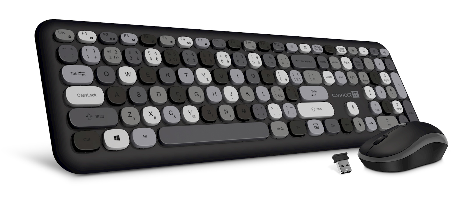CONNECT IT FASHION combo bezdrátová černo-šedá klávesnice + myš, ( +1x AAA +1x AA baterie zdarma), USB, CZ + SK