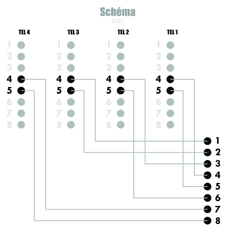 - adaptér pro sdružení 4 telefonních linek (2 žíly) do jednoho 4 párového kabelu