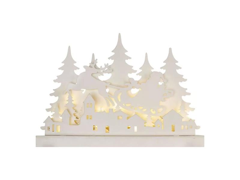 Dřevěná dekorace vánoční vesnička. Dřevěné dekorace navozují atmosféru tradičních Vánoc charakteristických vůní perníčků, zvukem vánočních koled a nezaměnitelnou chutí bramborového salátu. Dřevěná dekorace "vánoční vesnička" je vybavena příjemným teple bílým osvětlením. Díky napájení pomocí AA baterií ji můžete umístit na libovolné místo ve vašem interiéru a skvěle se bude vyjímat zejména na okenním parapetu, komodě či televizním stolku.