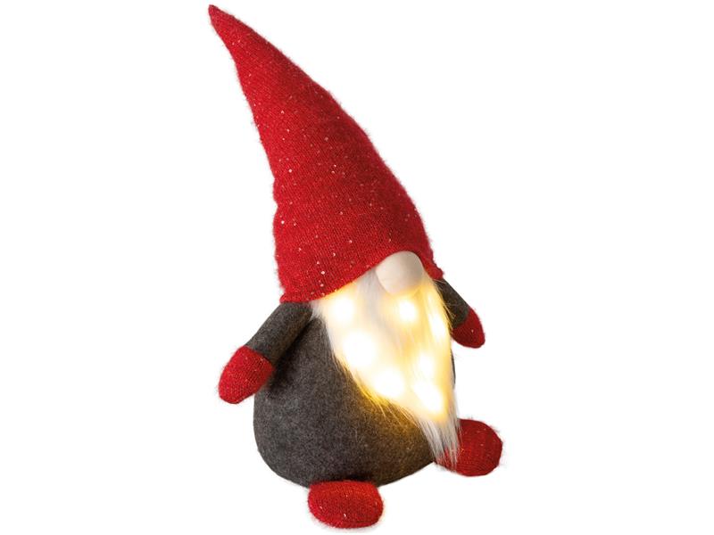Skřítek s LED světýlkem Technické parametry: - Výška 70 cm - Červené provedení - Počet LED: 6 - Časovač: Ne - Barva světla: Teplá bílá - Napájení: 2x CR2032