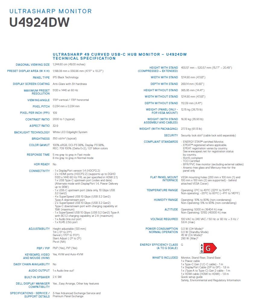 DELL ULTRASHARP 49 CURVED USB-C HUB MONITOR U4924DW: TECHNICAL SPECIFICATION