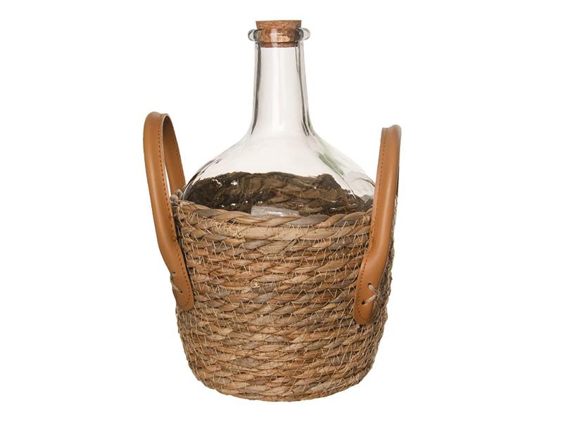 Demižon s opleteným dnem s uchy a korkovým špuntem. Uskladní nebo převeze víno nebo jiné tekutiny. Může být pěkným dárkem pro vaše blízké, když ho naplníte lahodným mokem vlastní výroby. Vlastnosti: - Materiál: sklo, listy rákosu, koženka - ucha, korek - Rozměry: objem 2,15 l, pr. 17 cm, v. 26 cm