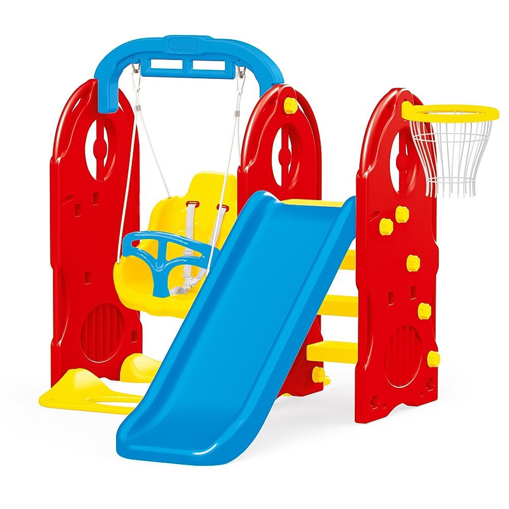 Základem hřiště je skluzavka a houpačka, kdy bezstarostná jízda na skluzavce a houpání všeobecně patří k těm nejoblíbenějším dětským aktivitám již od nejútlejšího věku. Stabilní robustní konstrukce základny, pevné široké schůdky a zaoblené hrany skluzavky zaručují zvýšenou bezpečnost použití, takže nedojde k vyvrácení hřiště nebo k případnému poranění vašeho dítěte v důsledku pádu či škrábnutí. Hluboká houpačka je navíc vybavena speciálními popruhy pro zajištění dítěte, takže během pohupu nedojde k jeho vysmýknutí a k následnému úrazu.