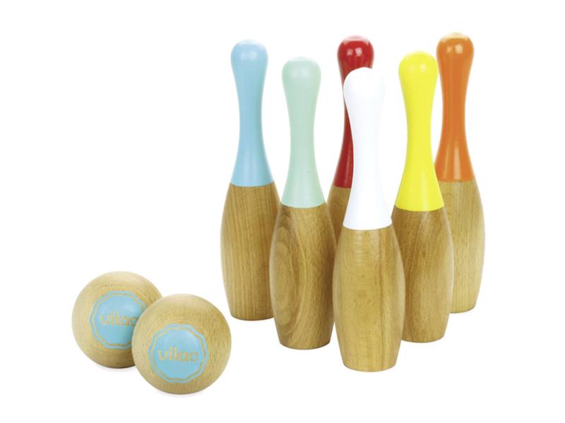 Set šesti dřevěných dvoubarevných kuželek a dvou koulí. Dřevo je lakované. Zabaleno v krásném batůžku. Vyrobeno ve Francii. Vlastnosti: - Rozměry: 24 x 5,2 cm - Materiál: Dřevo