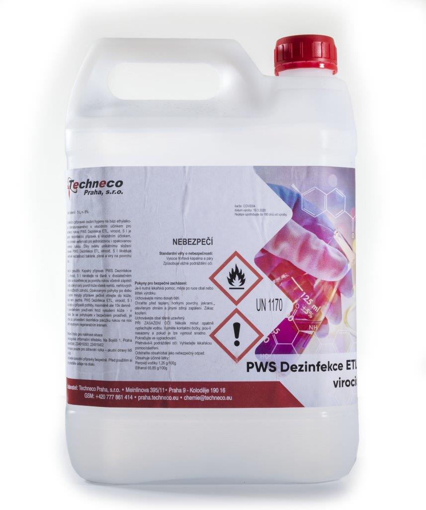PWS dezinfekce ETL je přípravek osobní hygieny na bázi ethylalkoholu s virucidním účinkem vhodná k dezinfekci rukou, nákupních košíků, madel, klik dveří a dalších povrchů, které je třeba dezinfikovat. Díky kvalitním surovinám, ze kterých je dezinfekce vyrobena, není tolik cítit po alkoholovém zápachu jako Anti-Covid. Kanystr obsahuje 5 litrů dezinfekce.