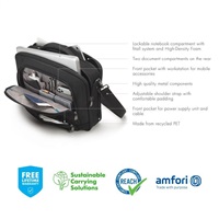 Characteristics • Made of 11 recycled PET bottles • Lockable and cushioned notebook compartment with High-Density Foam (HDF) and reinforced frame • Adjustable notebook strap with fitall system • Padded slip pocket (Nylex material) for tablets up to 12.9" • Front compartment with zip-pocket and workstation for mobile accessories • Additional zip pocket for power supply unit and cable • Two document compartments at the rear • Riveted comfortable carry handle