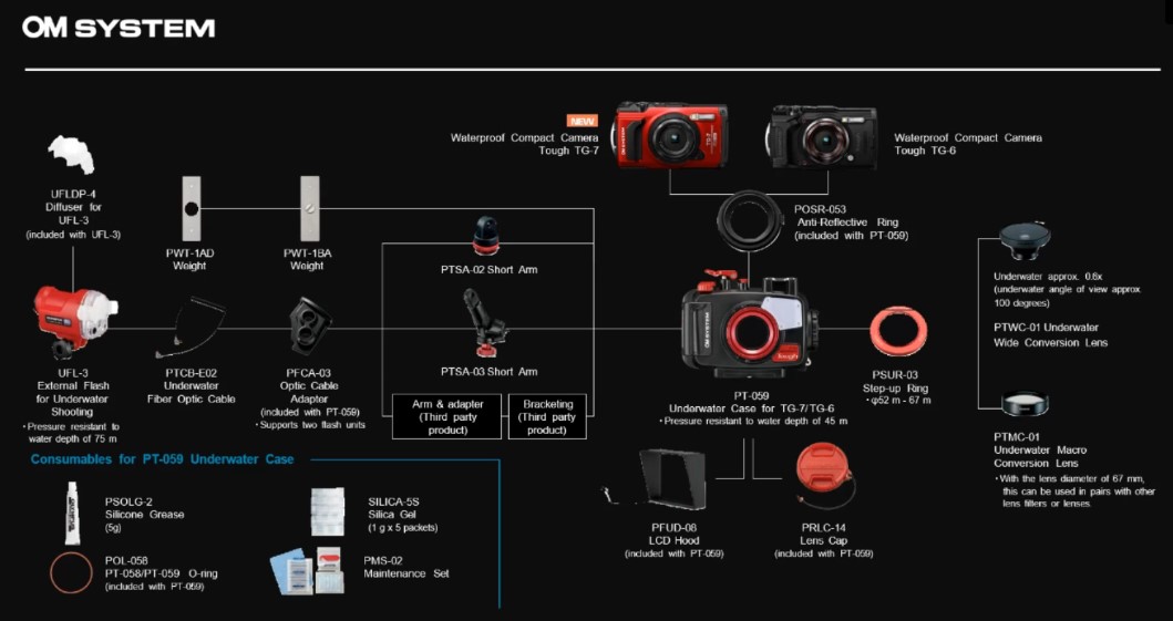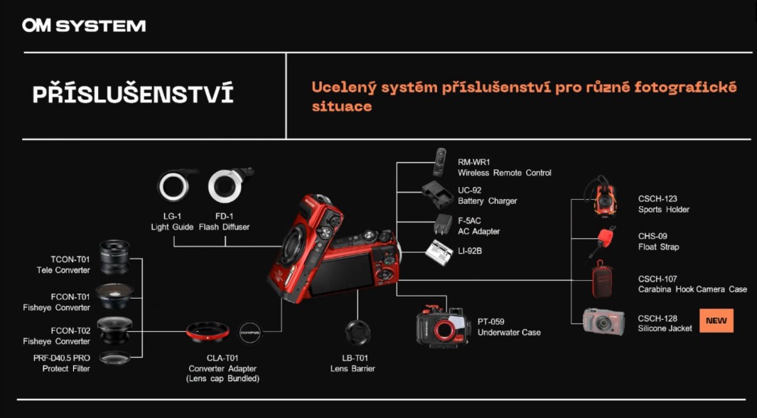 K fotoaparátu TG-7 si volitelně dokoupíte širokou škálu příslušenství. Ovládání na dálku vám umožní bezdrátové Bluetooth ovládání RM-WR1. Praktický řemínek CSH-09 funguje jako ochrana fotoaparátu před potopením do vody. A se silikonovým pouzdrem CSCH-128 ochráníte zařízení před poškrábáním. Pokud se chcete ponořit hlouběji do vody, oceníte podvodní pouzdro PT-059.